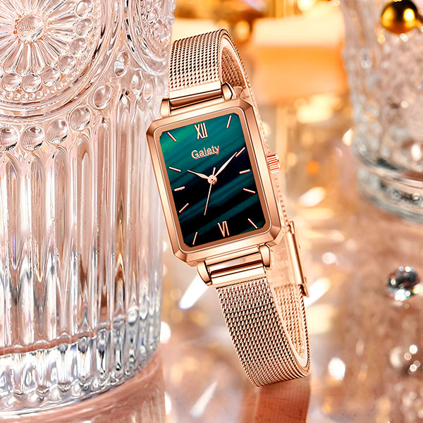 Tyto hodinky mají lesklou růžově zlatou barvu a krásný zelený ciferník. Dodají styl každým šatům, džínům nebo formálnímu oblečení.