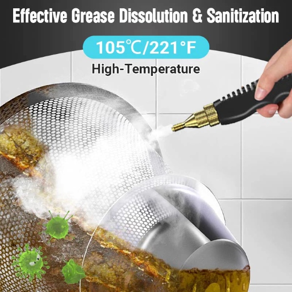 Jmenovitý výkon 1600W vytváří páru až 105℃ za méně než 10 sekund, což rychle odstraňuje mastnotu, špínu, prach a skvrny z různých povrchů.